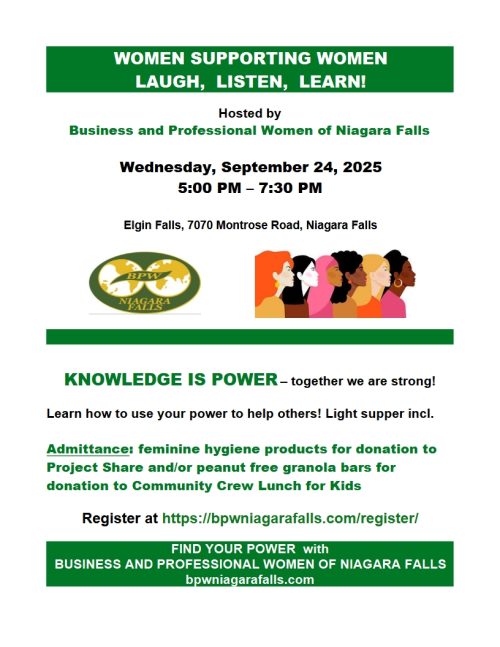 - September 24, 2025 5:00 p.m. — WOMEN SUPPORTING WOMEN – LAUGH, LISTEN, LEARN! — Register by Friday September 19 — Join us @ Elgin Falls, 7070 Montrose Road, Niagara Falls